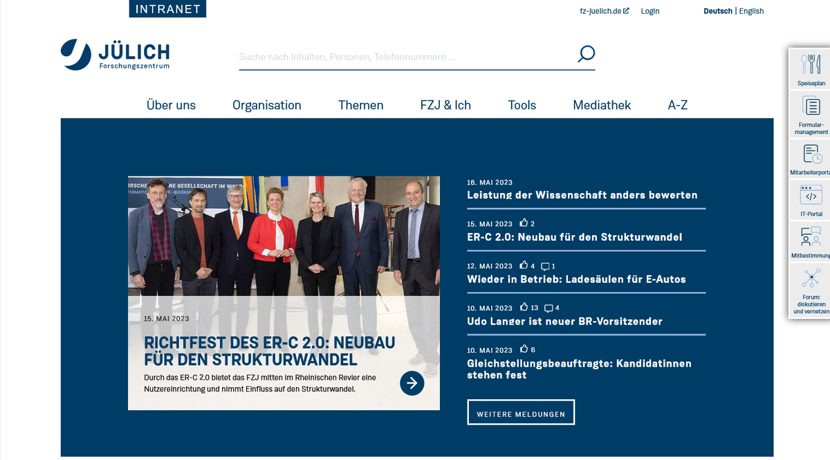 Das Intranet, die interne Kommunikationsplattform des Forschungszentrums Jülich, ist ein Service, der sich ausschließlich an die Mitarbeiter:innen des Forschungszentrums richtet. Um die Plattform aufrufen zu können, benötigen Sie Zugriff auf das FZJ-Netzwerk. Stellen Sie daher, bevor Sie auf den folgenden Button klicken, sicher, dass Sie eine funktionierenden VPN-Verbindung haben oder Sie sich im internen FZJ-Netzwerk befinden.